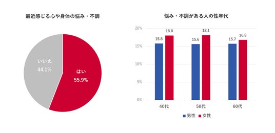 ・心や身体の悩みや不調を感じると回答した人は、半数を超えて55.9%となった。
