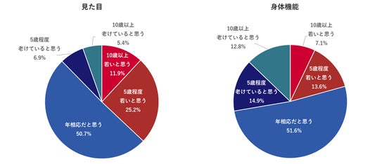 【実年齢と比べて、自身の見た目が若いと思っている人は約4割、身体機能が若いと思っている人は約2割】