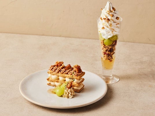 秋の季節のケーキとサンデーは植物由来食材のみのオールヴィーガンスイーツ。ケーキには秋の味覚「栗」をふんだんに使用、サンデーもジューシーなシャインマスカットを使用し、それぞれ季節を感じるスイーツとなっております。