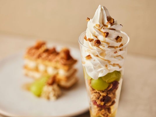 季節の果実サンデー季節のフルーツ「マスカット」を使用した、オールヴィーガンのサンデーです。シャンパンゴールドゼリーの爽やかさと、自家製グラノーラの香ばしさ、アーモンドミルクソフトの濃厚さ、メイプルシロップの上品な甘さ。それぞれの素材が織りなすハーモニーをお楽しみください。