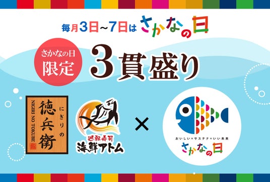 「にぎりの徳兵衛」「海鮮アトム」の各店では、毎月3日~7日の「さかなの日」に合わせ、2024年10月3日(木)より「さかなの日限定 三貫盛り」の販売を開始します。販売を通して「さかなを食べること」=SDGs達成に向けた消費行動であることについて知って頂き、おいしい魚を未来につないでいく活動を進めていきます。