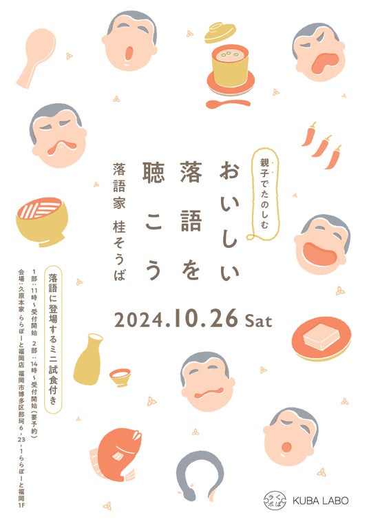 久原本家グループ(福岡県糟屋郡久山町 社主:河邉 哲司)は、「茅乃舎だし」など和風調味料を販売する株式会社 久原本家が運営する久原本家 ららぽーと福岡店内のイベントスペース「くばラボ」にて、10月26日(土)に今回2回目となる親子でたのしむ「おいしい落語を聴こう」と題したイベントを開催いたします。昨年好評だった福岡出身の落語家・桂そうばさんを今年もお迎えする、試食会付きの落語イベントです。