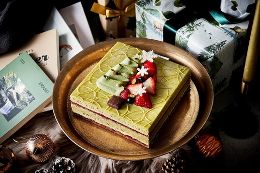 コーヒーシロップやキルシュシロップを染み込ませたピスタチオジョコンド、ピスタチオバタークリーム、ラズベリージャム、ピスタチオガナッシュ、ヘーゼルナッツのチョコレートを丁寧に層状に仕上げた見た目も美しいオペラ。表面はツリー型にピスタチオシャンティを飾り、いちごやラズベリーなど鮮やかなフルーツをオーナメントに見立てて飾りました。濃厚なピスタチオの風味を生かしたクリームとラズベリーの酸味の組み合わせが絶妙です。ご家族やご友人などとのお集りにもおすすめです。