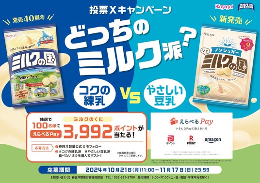 発売40周年を迎えた「ミルクの国」と新発売の「ノンシュガーソイミルクの国」、それぞれのミルクの味わいの特徴である「コクの練乳派」「やさしい豆乳派」のうち、食べてみたい方に投票いただく“どっちのミルク派?キャンペーン”を2024年10月21日(月)より春日井製菓公式Xにて実施いたします。