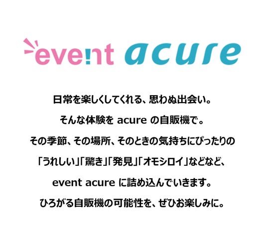 「event acure」は、季節やイベントに合わせてコンセプトを設定し様々な商品を展開していく百貨店の催事のようなものから、コンビニのレジ横のような話題の商品を取りそろえる、新しい形の自販機ビジネスです。飲料だけにとどまらず、さまざまな商品を販売していく予定です。