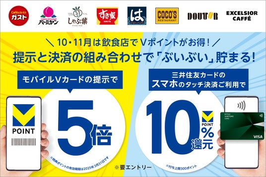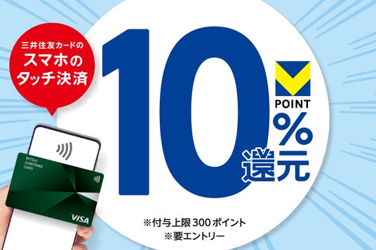 さらに同期間、V会員番号とSMBCグループのIDを連携の上、「三井住友カードのスマホのタッチ決済」でお支払いすると、Vポイントが最大10%還元されるキャンペーンも開催いたします。貯まったVポイントは、すかいらーくグループ、ゼンショーグループ、ドトールグループの各店舗で1ポイント=1円分として使うことができるほか、全国約16万店舗のVポイント提携先やVisaのタッチ決済に対応している世界の約1億店でもご利用いただけます。
