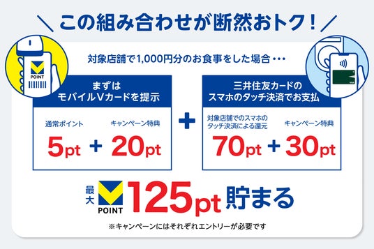 例えば、キャンペーン対象店舗で1,000円分(※1)のお食事をし、お会計時に「モバイルVカード」を提示すると、通常は5ポイントのところ25ポイント貯まります。さらに、「三井住友カードのスマホのタッチ決済」でお支払いすると、最大10%分にあたる100ポイントが貯まるため、2つのキャンペーンを組み合わせることで合計125ポイント貯まります。