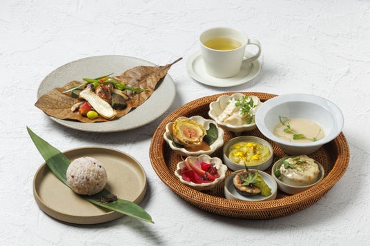 小鉢には、甘みが引き立つ無花果のフリット、万願寺唐辛子のソースでいただくソイミートの椎茸肉詰め、京都産豆腐を使った梨の白和えなど、秋の味覚を存分に楽しめる料理が揃います。メインディッシュには、よもぎ麩と秋野菜を朴葉と焼き上げた味噌焼き。さらに、「循環するお米」として知られる「えんこう米」のおにぎりと、京都の茶葉専門店「7T+(セブンティープラス)」がセレクトした日本茶などが選べるドリンクがセットとして付きます。