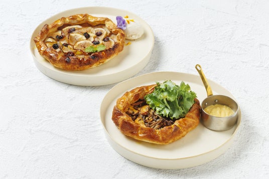 ミール系のパイには、白味噌のベース生地に、マッシュルームやエノキ、エリンギなどのたっぷりのキノコをトッピング。お好みでヴィーガンチーズソースをかけてお召し上がりいただきます。