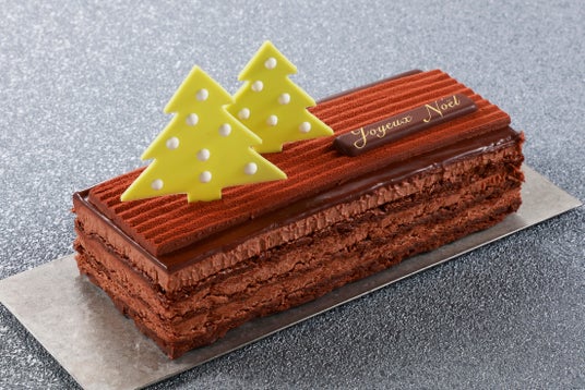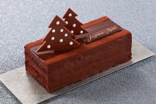 カカオとアーモンドの香り高いビスキュイと、濃厚なヴェネズエラ産カカオのムースの組合せ。ジャン=ポール・エヴァンを代表する定番ガトーに、ショコラでできたツリーのデコレーション。