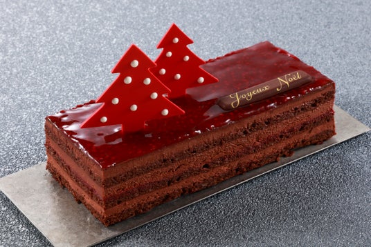 ヴェネズエラ産カカオを使用したムースと、フランボワーズのコンフィチュール、アーモンドとカカオのビスキュイを重ねたガトー。ショコラでできた赤いツリーと、艶やかなフランボワーズのコンフィチュールがクリスマスを彩ります。