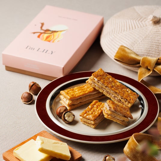 フランス産の小麦と芳醇な香りの発酵バターを使用したサクサク食感のパイ生地とヘーゼルナッツクリームを丁寧に重ね合わせた一品。