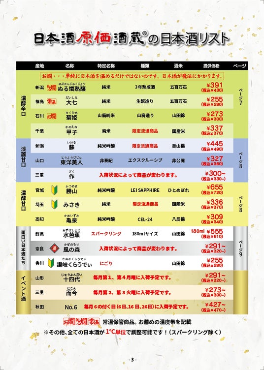 ※上記メニューの他に各店限定日本酒を10~15種ほどご用意いたします。