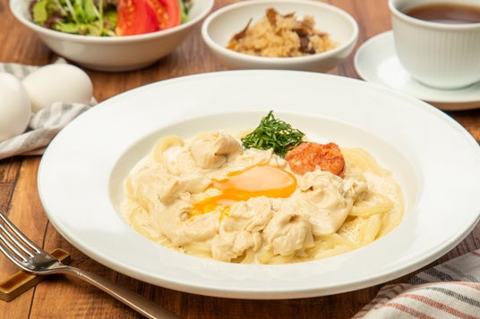 ■『湯葉と明太子の豆乳カルボナーラうどん』1,380円(税込)(鶏五目御飯/サラダ)