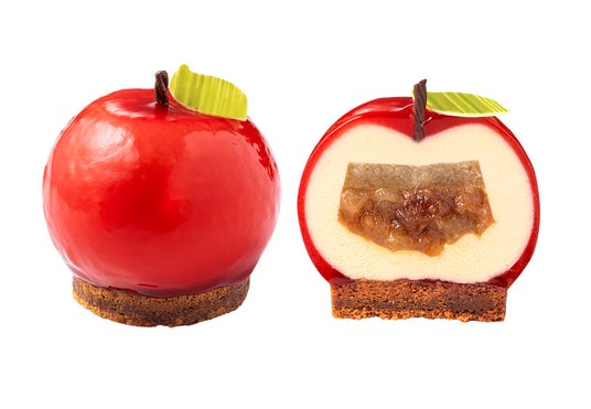 可愛すぎる見た目はもちろん、味わいもりんご尽くしの『THEアップル』。つやつやのりんごグラサージュにぎっしりと包まれているのは、カスタードにバターを加えたりんご風味のクレームムースリーヌ。バターのコクとりんごの爽やかな風味がとけあう、くちどけなめらかなバタークリームです。さらに中には、グラニースミス使用の自家製コンポートときゅんと甘酸っぱいアップルジュレを2層仕立てに重ねました。ひとくち頬張れば、もぎたてりんごのようにジューシーな美味しさがおくちいっぱい広がります。