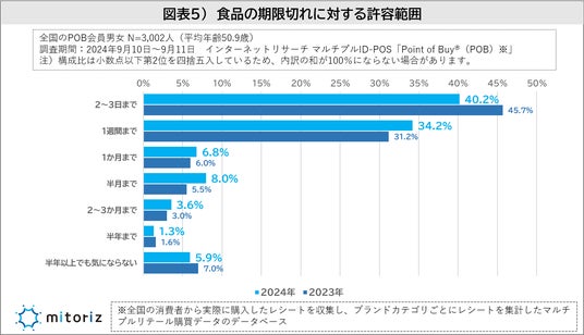 「食品の期限切れに対する許容範囲」については「2~3日まで(40.2%)」が最も多い結果となりましたが、2023年からは5.5Pt減少しています。一方で「1週間まで(34.2%)」が3.0Pt、また「半月まで(8.0%)」が2.5Pt、2023年から上昇しており、全体的に1週間から2~3か月までの許容範囲が2023年と比べて増加しています。「半年まで(1.3%)」および「半年以上でも気にならない(5.9%)」は2023年と比べて僅かに減少しましたが、全体としては期限切れに対する許容範囲が広がっている傾向がみられます(図表5)。