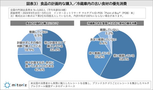 常に計画的に食品を購入する人は32.0%、冷蔵庫の古い食材を意識して優先的に使う人は58.1%