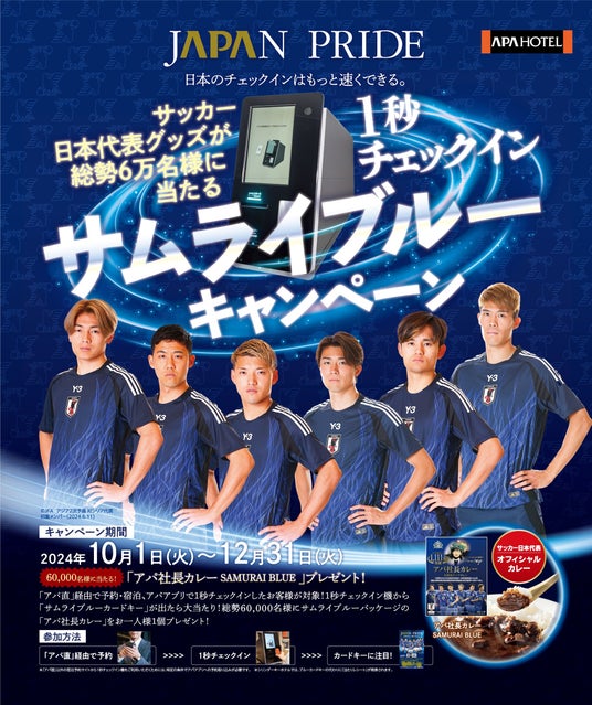 「1秒チェックイン サムライブルーキャンペーン」は、「アパ直(公式サイト・アパアプリ)」経由で予約・宿泊、アパアプリで1秒チェックインしたお客様が対象で、1秒チェックイン機(アプリチェックイン専用機)から『サムライブルーカードキー』が出たら、サッカー日本代表オフィシャルカレー「アパ社長カレー SAMURAI BLUE」を1人1個、総勢6万名様にプレゼントします。キャンペーン期間は2024年10月1日(火)から2024年12月31日(火)までの3か月間、アパホテル全館で毎日開催します。