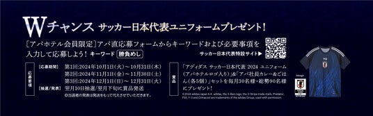 Wチャンスとして、サッカー日本代表のユニフォーム「アディダス サッカー日本代表 2024 ユニフォーム(アパホテルロゴ入り)」が抽選で90名様に当たるキャンペーンを毎月開催します。キーワードを入力するだけで「アパ直」からアパホテル会員が応募できるキャンペーンとなります。