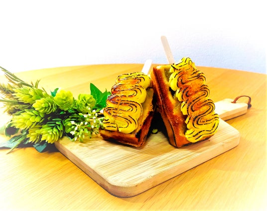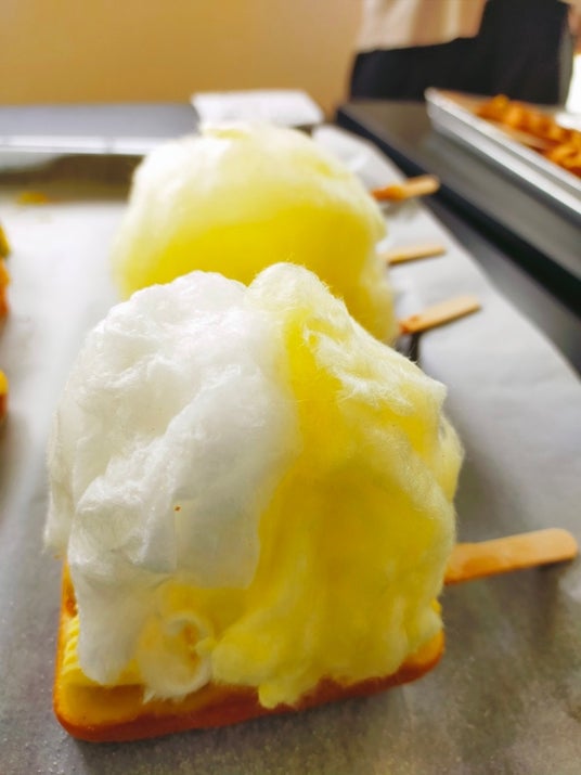 70にも及ぶレシピ案の中から厳選され、具現化された五霞町の新作スイーツがこの「すい~とぽてッフル」。ベースのワッフルは五霞町産のコシヒカリを米粉とさつまいもを使ってねっとり食感に仕上げています。中でもさつまいもは、茨城県内で最も生産量が多い紅はるかを焼きいもにしてから使用!カスタードクリームと綿あめをトッピングして、その綿あめに火をつけてブリュレします。さながら高級フレンチのような演出は見た目だけでなく、香りも食感も豊かにしてくれること間違いなし!また、ワッフルにスティックを指したワンハンドスタイルなのでイベント会場などでの食べ歩きにも最適です。