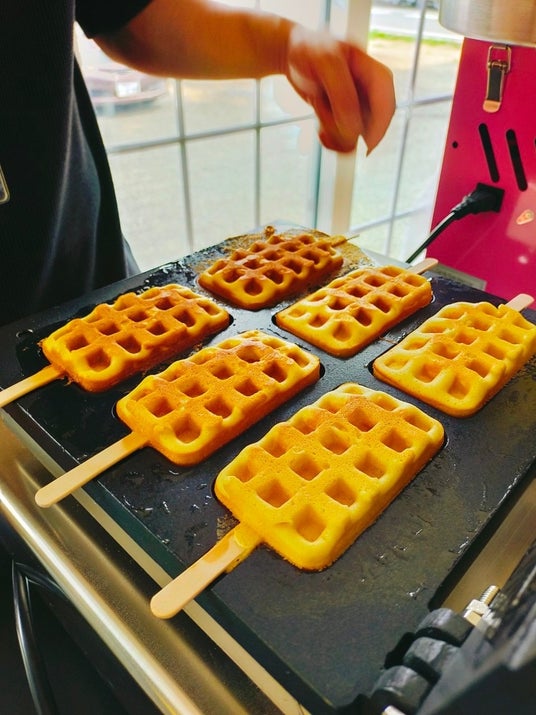 米粉のワッフルは食べやすさを意識して棒付きで提供します