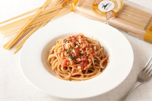 有機スパゲットーニ(ブラン入り)メニュー例_トマト・アーモンド・バジルのソース
