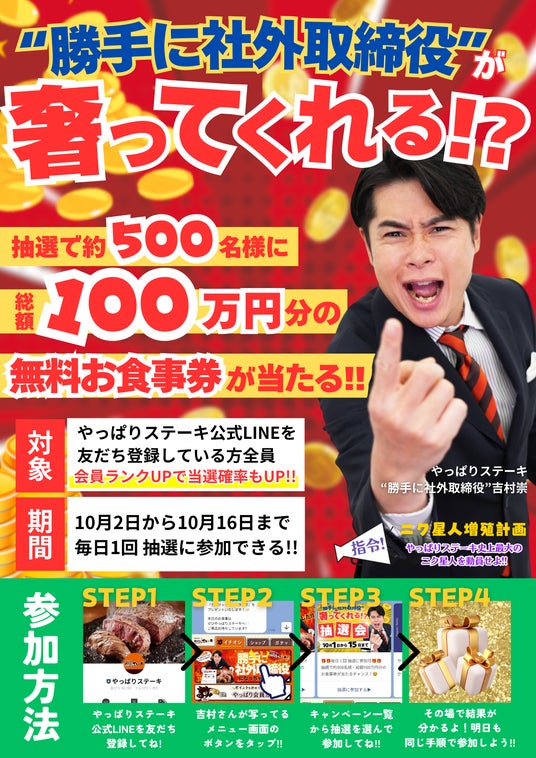 ニク星人増殖計画“勝手に社外取締役”吉村崇に総額100万円分のやっぱりステーキを奢ってもらおう!