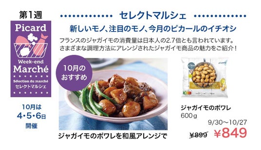 ◎ 毎月第1週目の金曜日、土曜日、日曜日の3日間は、「セレクトマルシェ」を開催!旬の食材を使った季節感のある商品や新商品、ピカールいち押しの商品がお買い得の週末イベントを毎月開催します!日本では馴染みの薄いフランス料理の商品や、試してみたいけどどんな商品なのか買うのに躊躇してしまいがちな商品などを毎月クローズアップします。また、ピカール社員だからこそ知っている商品の魅力も積極的に発信していきます。