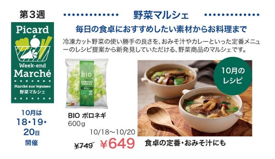 ◎ 毎月第3週目の金曜日、土曜日、日曜日の3日間は、野菜商品がお買い得な「野菜マルシェ」を開催!100%露地栽培にこだわったフランス産ならではの野菜の美味しさ、100種類以上のラインナップを誇る野菜の冷凍食品の魅力を、ピカールおすすめのレシピを通じて月替わりでご提案します。