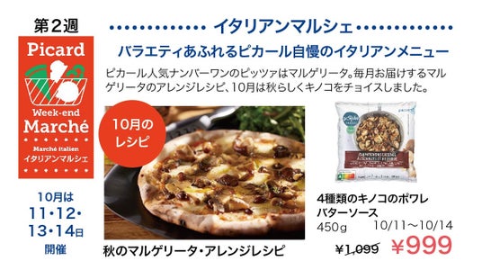 ◎ 毎月第2週目の金曜日、土曜日、日曜日の3日間は、「イタリアンマルシェ」を開催!ピッツァをはじめイタリアンな商品がお買い得の週末イベントを毎月開催します!ピカールでは大人気の「ピッツァマルゲリータ」を活用したアレンジレシピも月替わりでご提案します。
