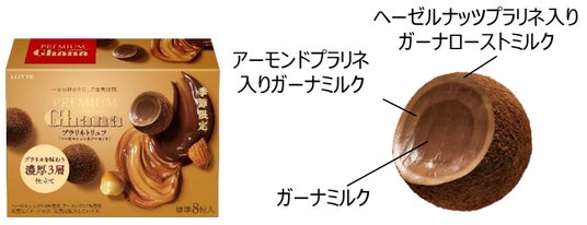 ◆こだわりの3層仕立てにより、2種のナッツプラリネのコク、ガーナの濃厚な味わいが、とろける口どけとともに楽しめます。