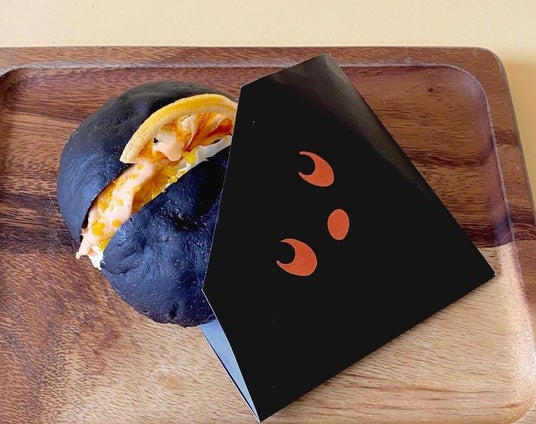 オレンジクリームと、白いマスカルポーネクリームの2色を、神戸のベーカリー「メゾン ムラタ」のオリジナルブラックカカオパンでサンドしました。あしらいには自家製のドライレモンなどを添えて甘さ控えめ、ほんのり甘酸っぱさの効いたおとなのクリームサンドです。オリジナルのブラック・ベア ワックスペーパーに包んで提供します。