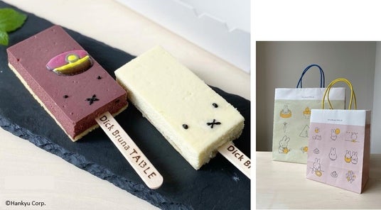 ディック・ブルーナ テーブルの定番スイーツ「ミッフィーチーズケーキバー」。定番のホワイトと、特別販売するマルーンカラーバージョンを2本セットで提供します。マルーンカラーバージョンは、カシスがさわやかに香るベリー味にアイシングで帽子をトッピング、ホワイトは濃厚プレーンのチーズケーキです。テイクアウトに便利なオリジナルショッパーバッグに入れるとギフトにもぴったりです。(Mサイズ1枚¥100、Sサイズ1枚¥50)