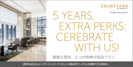 マリオット・インターナショナルのホテル「コートヤード・バイ・マリオット大阪本町」(所在地:大阪府大阪市中央区南本町2-3-7、総支配人:長尾祥平)は、10月1日に開業5周年を迎えることを記念し、『開業5周年、5つの特典付宿泊プラン Celebrate with Us!』を10月1日から12月31日まで販売いたします。