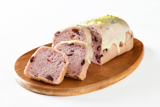 ラズベリーのピューレを練り込んだ生地に甘酸っぱい真っ赤なクランベリーがアクセント、焼き上げた表面にホワイトチョコレートをたっぷりコーティングしピスタチオをトッピングしました。柔らかな生地は噛むたびにもっちりとした食感に変化、ホワイトチョコレートのクリーミーで上品な甘さと絶妙にマッチした、優しい甘さが口いっぱいに広がります。淡いピンク色が可愛らしく、見ているだけで幸せな気分になるスイーツ感覚の一品です。朝食やおやつ、ティータイムのお供に、ぜひお召し上がりください。