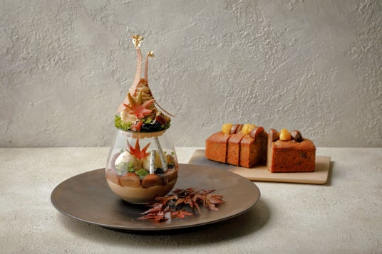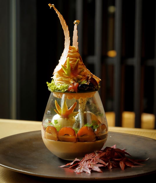エグゼクティブ ペストリーシェフ 松尾浩幸が考案するデザートは、季節の移ろいを反映し、独創的で繊細な美しさで毎シーズン人気を博してきました。ほんのりと涼やかに感じられるこの季節、昨年ご好評いただいた秋の森の庭にインスパイアされたモンブランパフェ「The Art of 丹波栗」をリニューアルしてお届けいたします。丹波栗をふんだんに使用し、アイスクリームやチョコレート、ブリュレなど、様々にアレンジを加え、グラスの器を美しく彩ります。