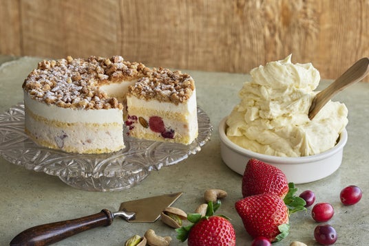 真っ赤な甘酸っぱいベリーとナッツをふんだんに入れた、チーズとバニラが香るミルキーなムースの上に、サクサクのスパイシーでバター感のあるクランブルをたっぷり乗せました。果実とバターが口いっぱいに広がる、驚きのあるケーキです。