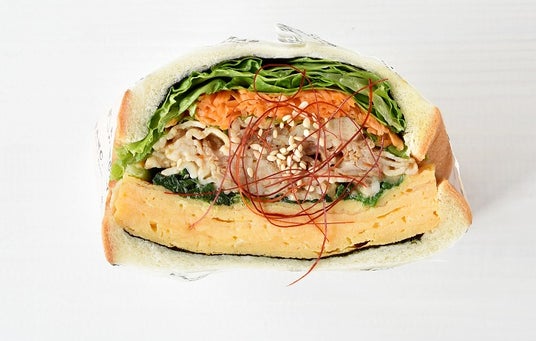 信州米豚のお肉たっぷりキンパサンド青山玉子の玉子焼きと信州米豚の焼肉、ごま油香る人参ナムルをサンドしました