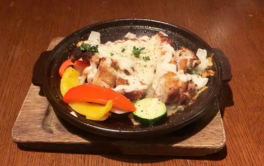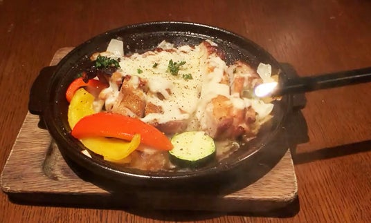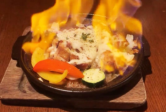 思わず見とれてしまう、迫力満点の炎!パリッと香ばしく焼けた皮とジューシーなお肉、カラフルな野菜、とろ~りチーズの美味しい組み合わせをお楽しみいただけます。