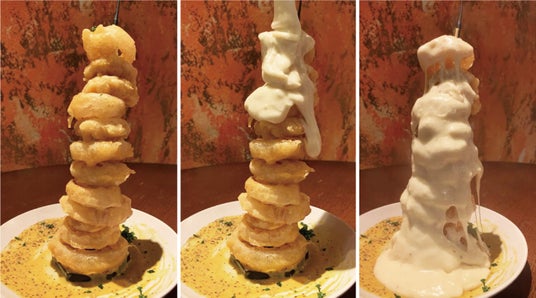ツリーのようなチキンオニオンリングに、衝撃のナイアガラチーズ!