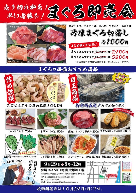 「とる うる つくる 全部、SANKO」をスローガンに、飲食事業と水産事業を両軸経営で「産地活性化プラットフォーマー」としてオンリーワンのビジネスモデルを展開し、新たな市場の創造に取り組む株式会社SANKO MARKETING FOODSは、グループ会社である浜松市中央卸売市場の仲卸「SANKO海商」の恒例イベント「まぐろ解体ショー&即売会」を2024年9月29日(日)8時より大塚加工場にて開催いたします。
