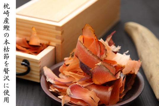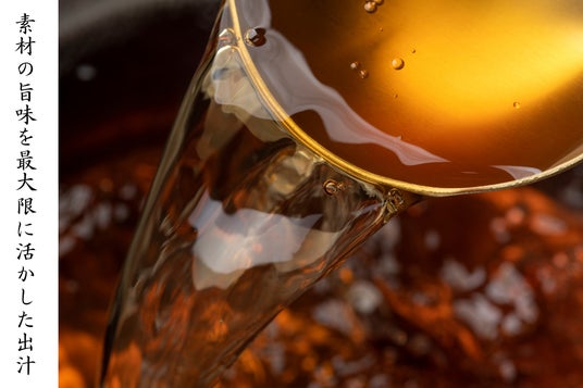 出汁に使用するのは鹿児島の宝、枕崎産鰹の本枯節をはじめ、ソウダ節・サバ節・ウルメ節を贅沢にブレンドした深みのある旨味の一番出汁