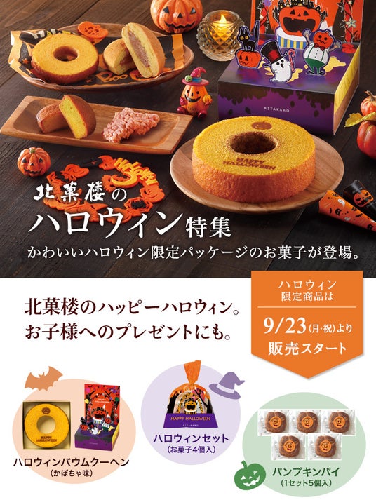 「ハロウィンバウムクーヘン(かぼちゃ味、焼印入り、オリジナルポップアップパッケージ)」直径14cm・高さ4cm 1箱1,800円(税込)、「ハロウィンセット(お菓子4個入)」1袋700円(税込)、「パンプキンパイ(5個入)」1箱900円(税込)