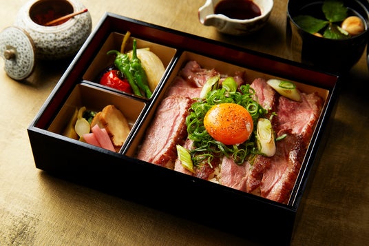 「横濱ビーフ重」は横濱ビーフのサーロインを低温でロースト、バターとチキンブイヨンで作ったバターライスにふわっとかぶせました。口に入れるとすぐにほどけてしまうほどの柔らかさを楽しんだり、一緒に添えられたわさびをお肉に巻いてアクセントにしたりして、お召し上がりいただくのもおすすめです。