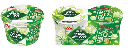 この度、「森永アロエヨーグルト」シリーズから、アロエ葉肉のみずみずしい食感と、爽やかでコクのあるヨーグルトのおいしさはそのままに、定番2品のアロエ葉肉量と粒数を増量し、リニューアルします。「森永アロエヨーグルト」は、アロエ葉肉量を15%増量※1します。「森永アロエヨーグルト 2連」は、アロエ粒数を50%増量※2し、アロエ葉肉の食感が楽しめる味わいにリニューアルします。