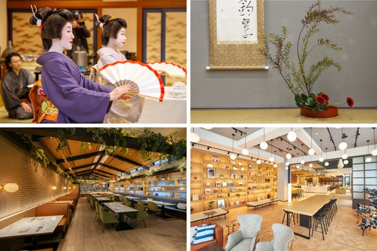 【上段左】 芸妓による日本演舞イメージ(手前:「すずめ」 奥:「こと美」)※写真提供:名妓連組合 【上段右】 いけばな作品イメージ ※写真提供:近藤 価世子 【下段左】 『芸妓ja NIGHT』 会場の 「style kitchen」 内観 【下段右】 『英語でいけばな』 会場の 「コミューナルロビー」内観