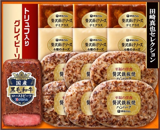 弊社ギフトセットの中で売上No.1セット※である「至福の洋食 田崎真也セレクション」のローストビーフ&ハンバーグセットを参考に、黒毛和牛ローストビーフ入りの高価格帯セットを新発売します。焙煎した黒胡椒を程よく使用した黒毛和牛のローストビーフと、「二重包餡」「鉄板焼き」「過熱蒸気オーブン仕上げ」の3つの手順を経て手間を惜しまず作った、こだわりのハンバーグを詰合せています。160gのハンバーグと100gのソースのボリューム感あふれる内容となっており、ソースは、「パルメザンチーズ、モッツアレラなど4種のチーズを使用したとろりとしたソース」と「赤ワインを加えた濃厚なコクが楽しめるデミグラスソース」の2種類をご用意しました。たっぷりソースをかけたボリューミーなハンバーグは食卓を彩ります。