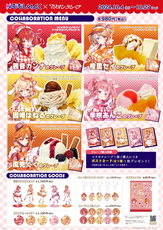 イベント期間中は対象のマリオンクレープ店舗で限定イラストのコラボグッズの他に、ななしいんくのメンバーが考案した5種の特製メニューも発売!
