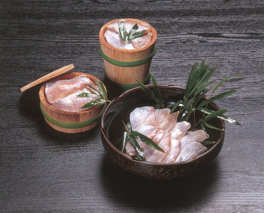 若狭小鯛はやや黄色をおびた薄紅色が特長で福井県では年間を通じて漁獲されます。レンコダイ(連子鯛)とも呼ばれ、延縄漁や底曳網漁で獲れ、価格も手頃なことから庶民の魚としても親しまれてきました。淡泊で上品な味わいが魅力の若狭小鯛を3枚におろし、酢と塩で調味して杉樽に詰めた「若狭小浜小鯛ささ漬け」は、若狭を代表する名産品です。