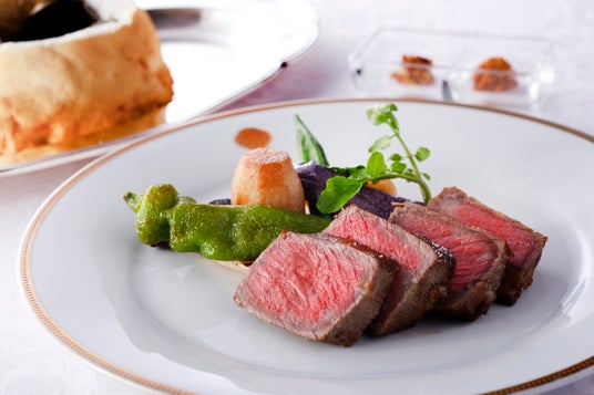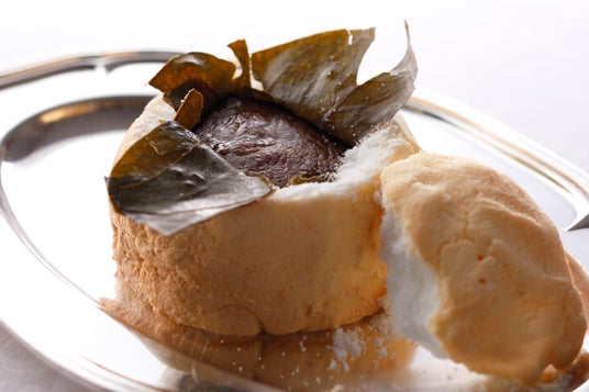 ビール酵母を原料とした発酵飼料により長期飼育された高知県四万十産“四万十麦酒牛”。肉の繊維がしっかりとつまり、余計な脂がないサーロインを「井上糀店」の塩麹に漬け、柿の葉で包み香りを移し、塩釜で焼き上げました。